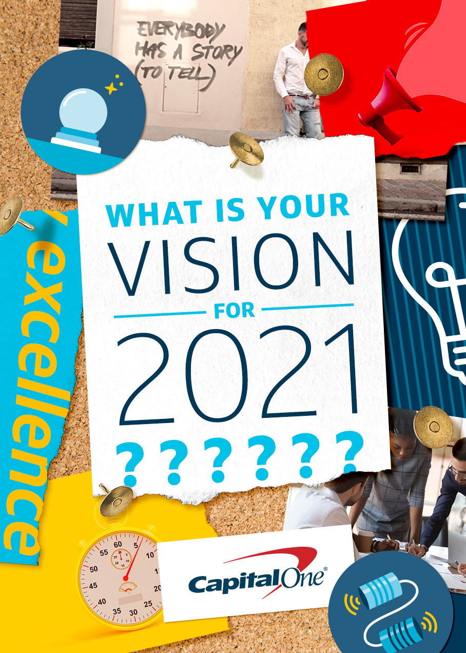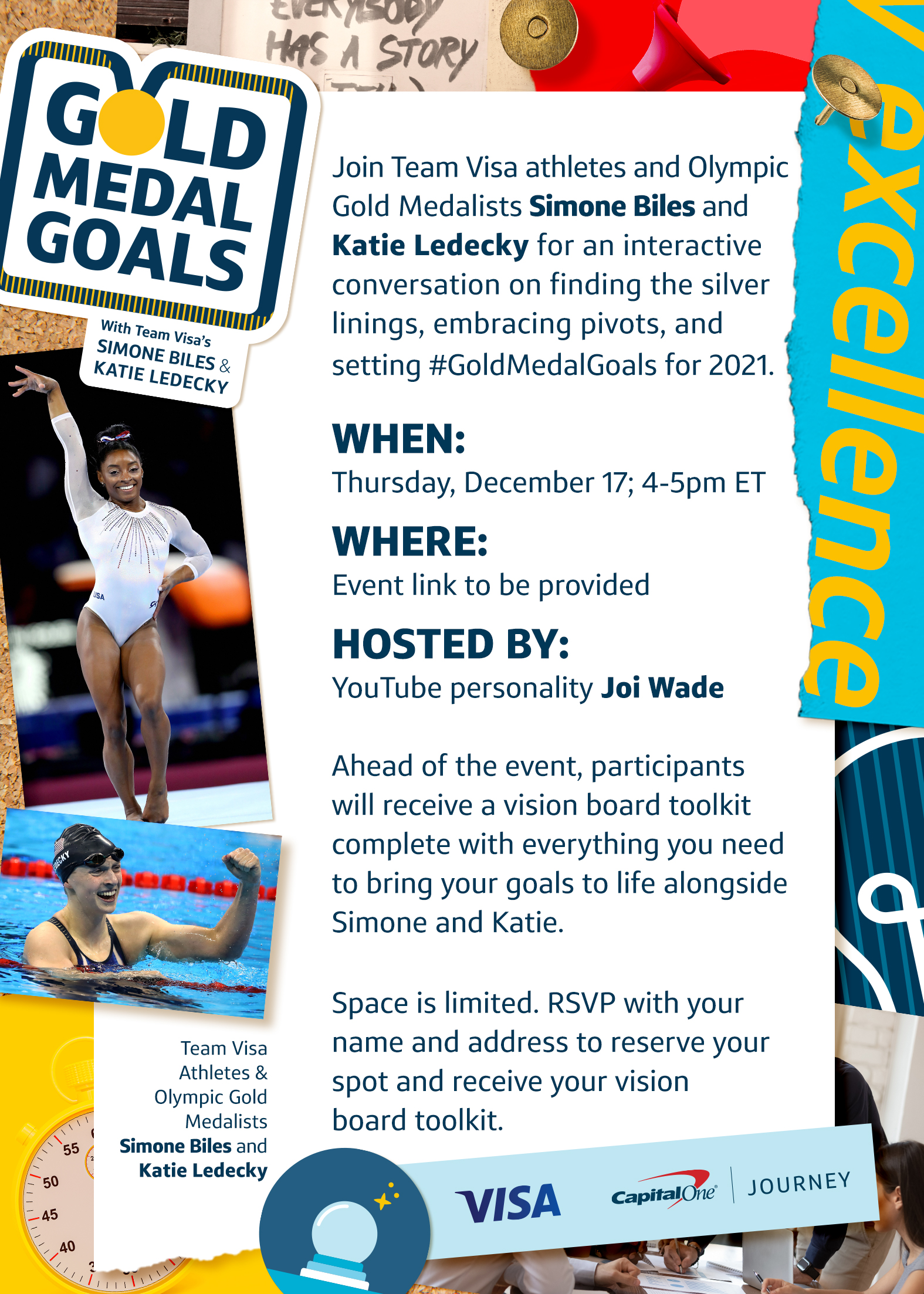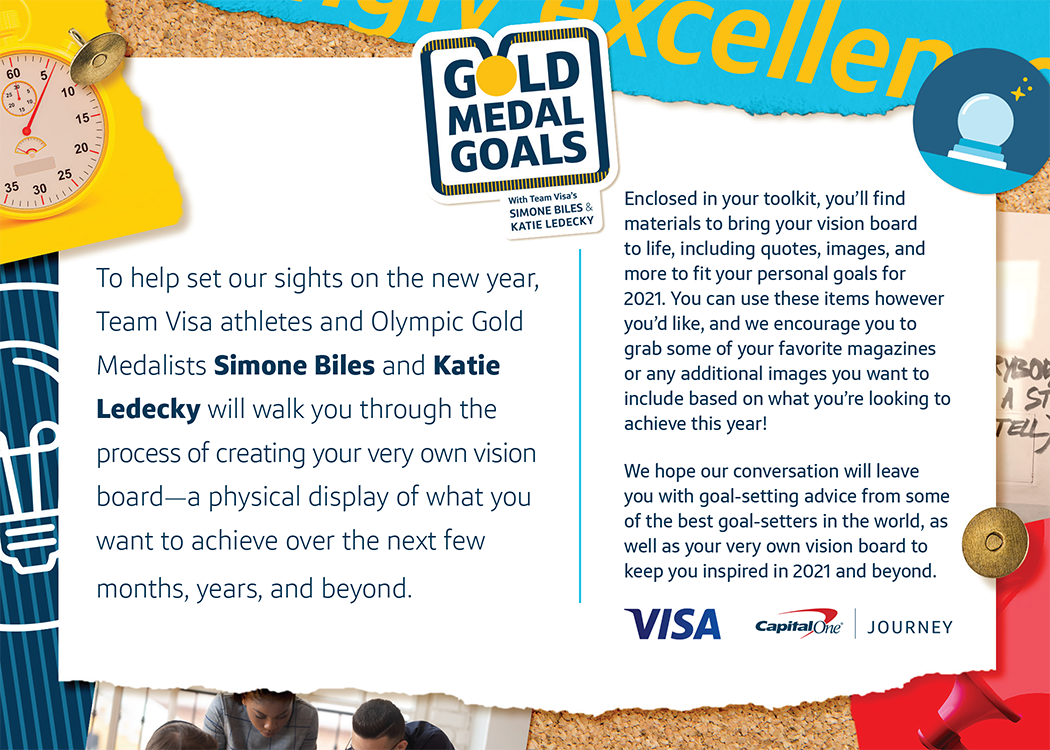 2020 forced a cultural shift like no other. Concern for public health shuttered businesses and isolated communities. The Tokyo 2020 Olympics were postponed to 2021 and pared down in scale. In-person business meetings and events migrated to online experiences. Capital One wanted to spread hope for 2021 by organizing an internal Zoom event with two iconic Olympians—Simone Biles and Katie Ledecky. “Gold Medal Goals” was born. The logo needed to embrace a sporting spirit and lots of information, as showcased in the comps and final logo above. To finish out the identity, I incorporated a bright vision board theme into emails and mailer inserts.