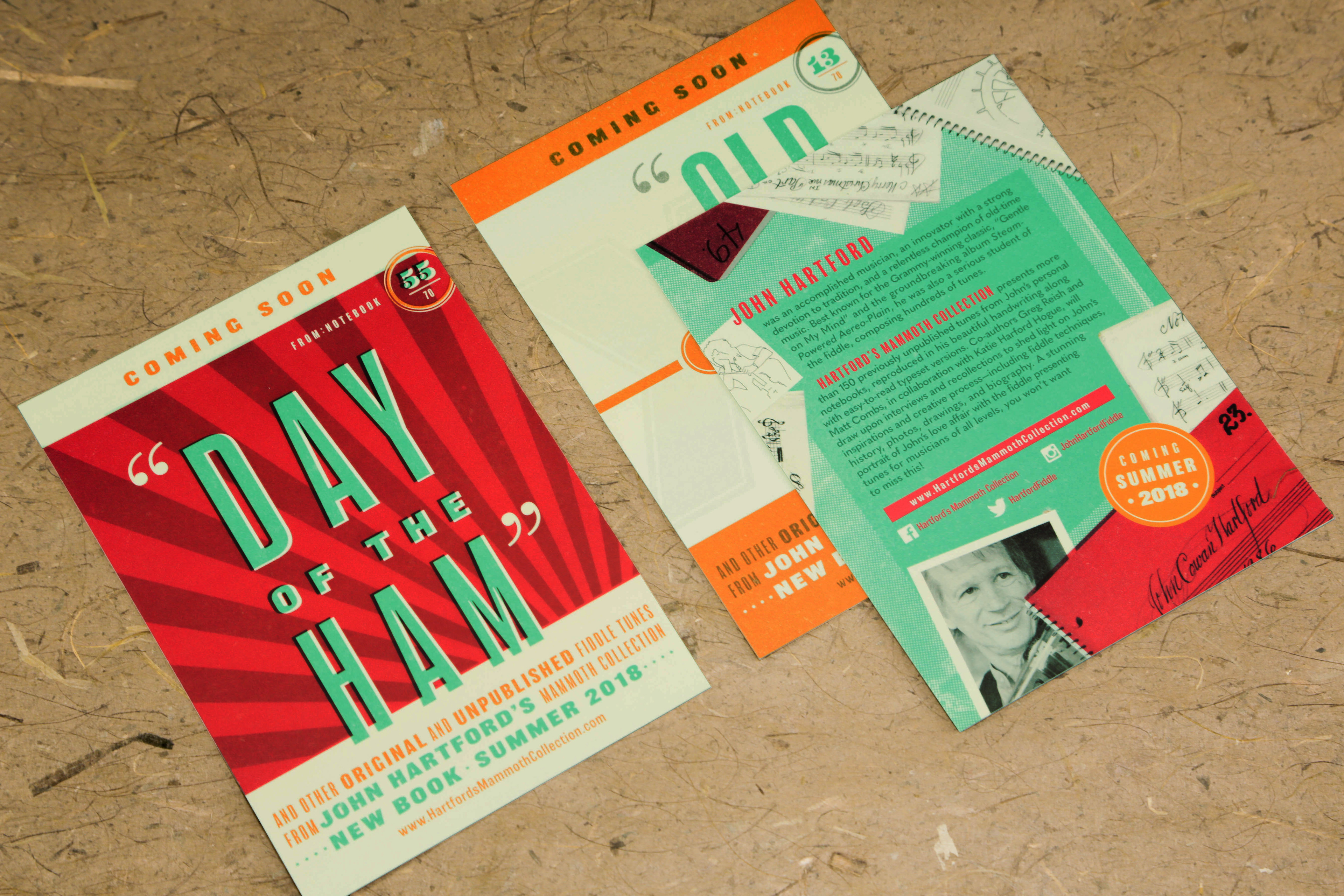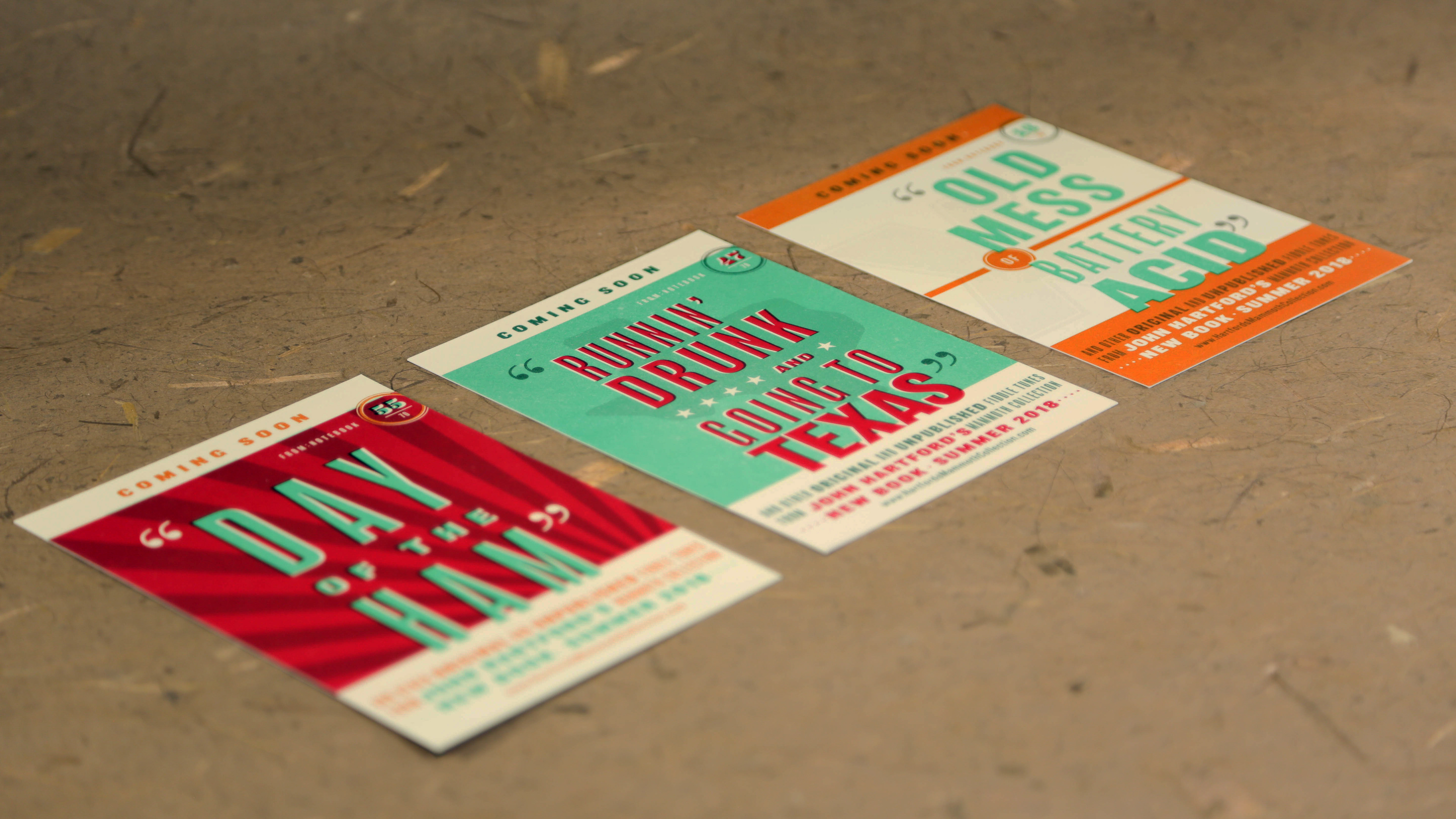 John Hartford was a beloved icon in bluegrass and country music. When his estate compiled an annotated book of his personal illustrations, notes, and more than 150 unreleased songs, I was tasked to create a memorable promotion to celebrate the release. Drawing from some memorable titles of his fiddle tunes and the legendary style of show posters by Hatch Show Print, I designed a set of collectible postcards to distribute at music festivals and conventions.